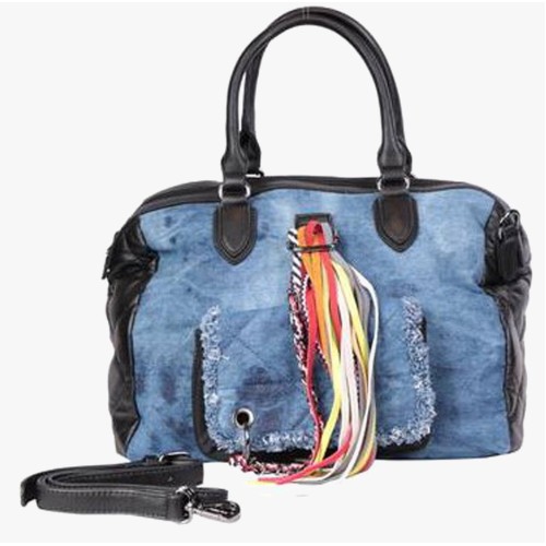 Ευρύχωρη γυναικεία τσάντα BARTUGGI από τζιν με διακοσμητικά χρωματιστά σκοινάκια, μπροστινή τσέπη κα..