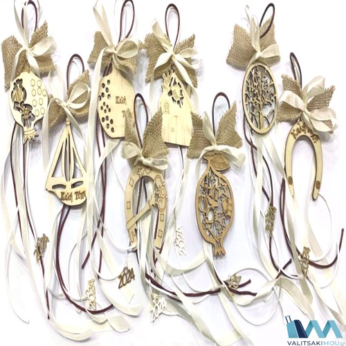 Χριστουγεννιάτικα Γούρια (Πακέτο), από ξύλο με διάφορα σχέδια, κορδέλα με ευχές & σχοινί. ..