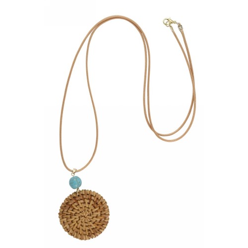Κολιέ Ψάθινα Ξύλο Με τυρκουάζ+στρόγγυλο ψάθινο μοτίφ..