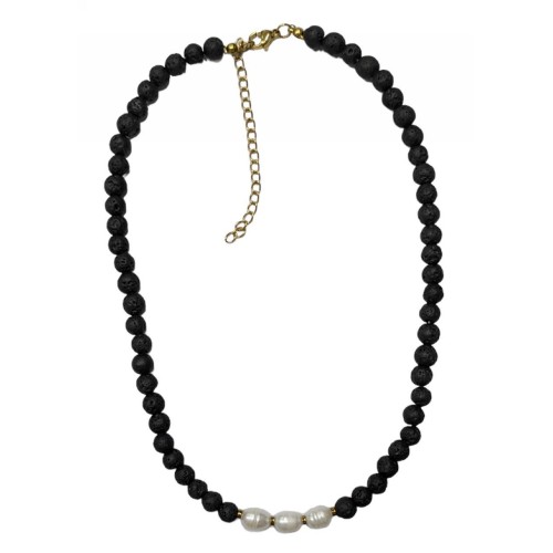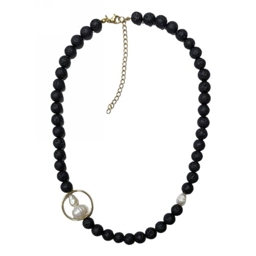 Κολιέ με πέτρα λάβα και μαργαριτάρι με ατσάλινες λεπτομέρειες. Διαστάσεις : 40cm (+7) ..