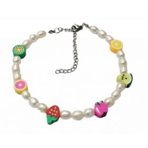 Βραχιόλι Ποδιού με ατσάλινη αλυσίδα, μαργαριτάρια και φίμο φρούτα Μήκος: 21 (+7)cm..