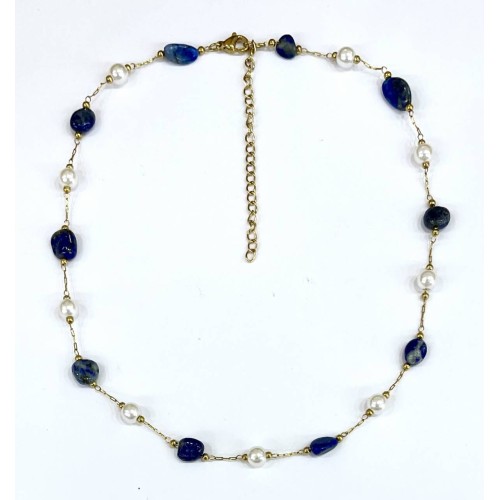 Κολιέ Ατσάλι Ατσάλι Διάφορες πέτρες με μπλε πέτρα και πέρλα MHK:39+7CM ΧΡΩΜΑ:18k gold..