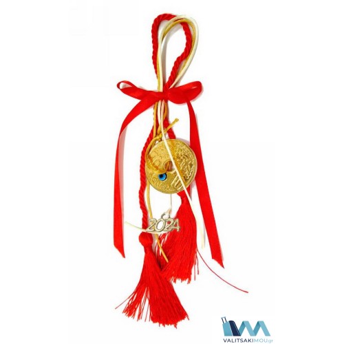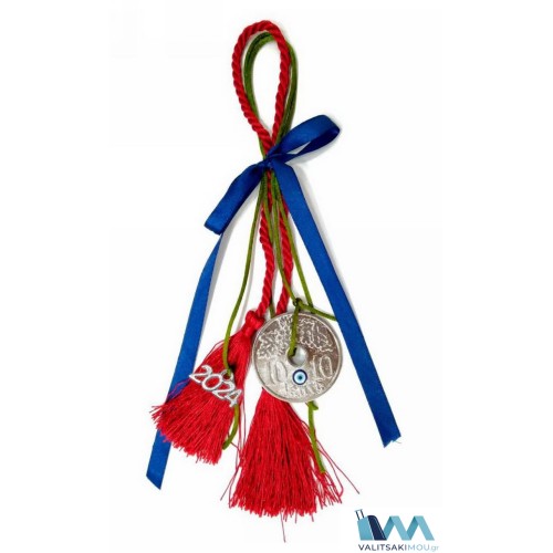 Γούρι Χριστουγεννιάτικο 2024 από μέταλλο Δεκάρα με μάτι, κόκκινη φούντα & μπλε κορδέλα. Προσοχή Μό..