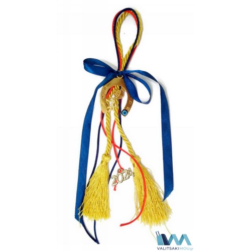 Γούρι Χριστουγεννιάτικο 2024 από μέταλλο Πέταλο με μάτι, χρυσή φούντα & μπλε κορδέλα. Προσοχή Μόνο..