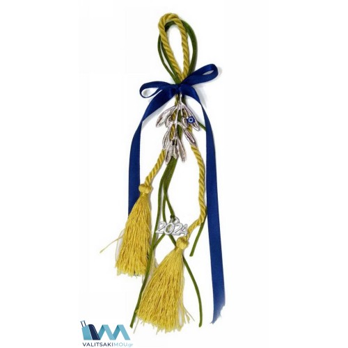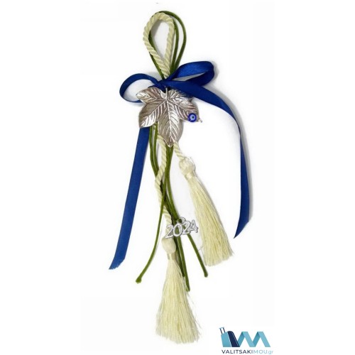 Γούρι Χριστουγεννιάτικο 2024 από μέταλλο Κλαδί Ελιάς με μάτι, χρυσαφί φούντα & μπλε κορδέλα. Προσοχ..