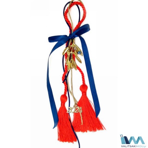 Γούρι Χριστουγεννιάτικο 2024, από Μέταλλο, Κλαδί Ελιάς με μάτι, πορτοκαλί φούντα & μπλε κορδέλα. Πρ..