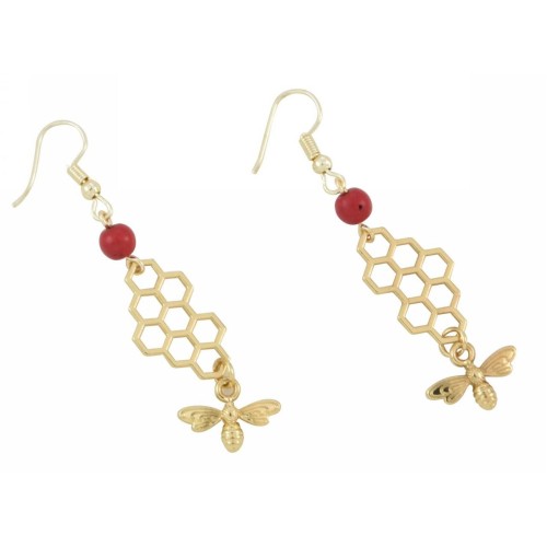 Σκουλαρίκια Με πέτρα Πέτρα Κοράλι Κοράλι με χρυσαφί μεταλλικό μοτίφ μελισσούλα..