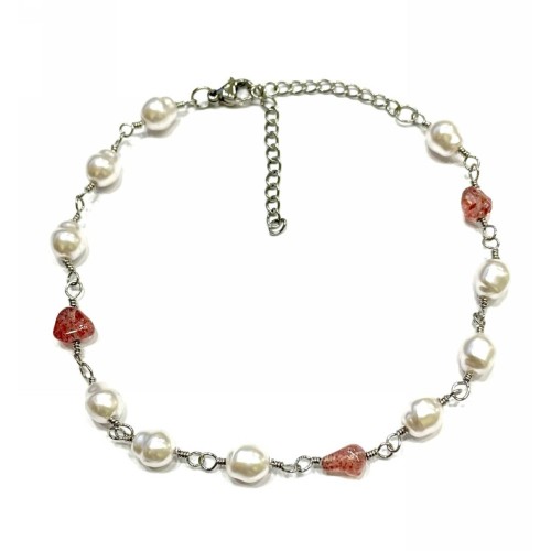 Kostibas 2012-901A3, Βραχιόλι ποδιού, Μεταλλικό, Ασημί, Με πέρλες και κόκκινες πετρούλες