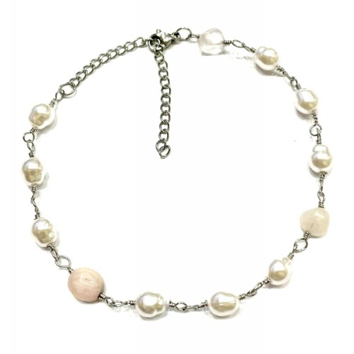 Kostibas 2012-901A4, Βραχιόλι ποδιού, Μεταλλικό, Ασημί, Με πέρλες λευκές και ροζ πετρούλες