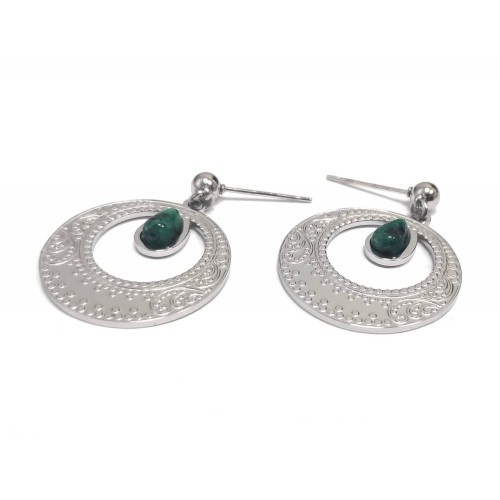 Σκουλαρίκια Πέτρα 316L, κρίκος με μαλαχίτη σε χρώμα Ασημί, Διάμετρος 2cm..