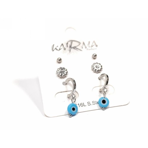 Σκουλαρίκια Ατσάλι 316L, 3 ζευγάρια (κρίκος μάτι, λουλούδι και μπίλια) σε χρώμα Ασημί..