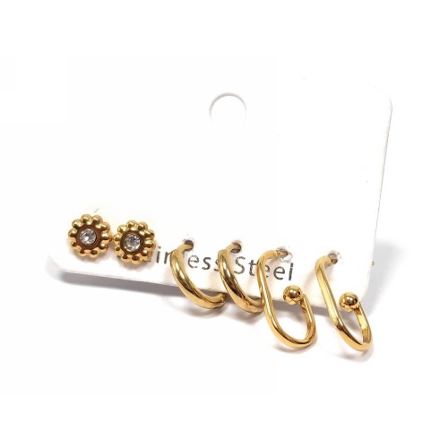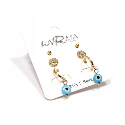 Σκουλαρίκια Ατσάλι 316L, 3 ζευγάρια (κρίκος μάτι, λουλούδι και μπίλια) σε χρώμα Χρυσαφί..