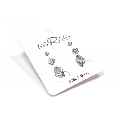 Σκουλαρίκια Ατσάλι 316L, 3 ζευγάρια (μπίλια στρας, λουλούδι στρας και φύλλο) σε χρώμα Ασημί..