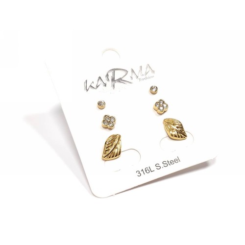 Σκουλαρίκια Ατσάλι 316L, 3 ζευγάρια (μπίλια στρας, λουλούδι στρας και φύλλο) σε χρώμα Χρυσαφί..